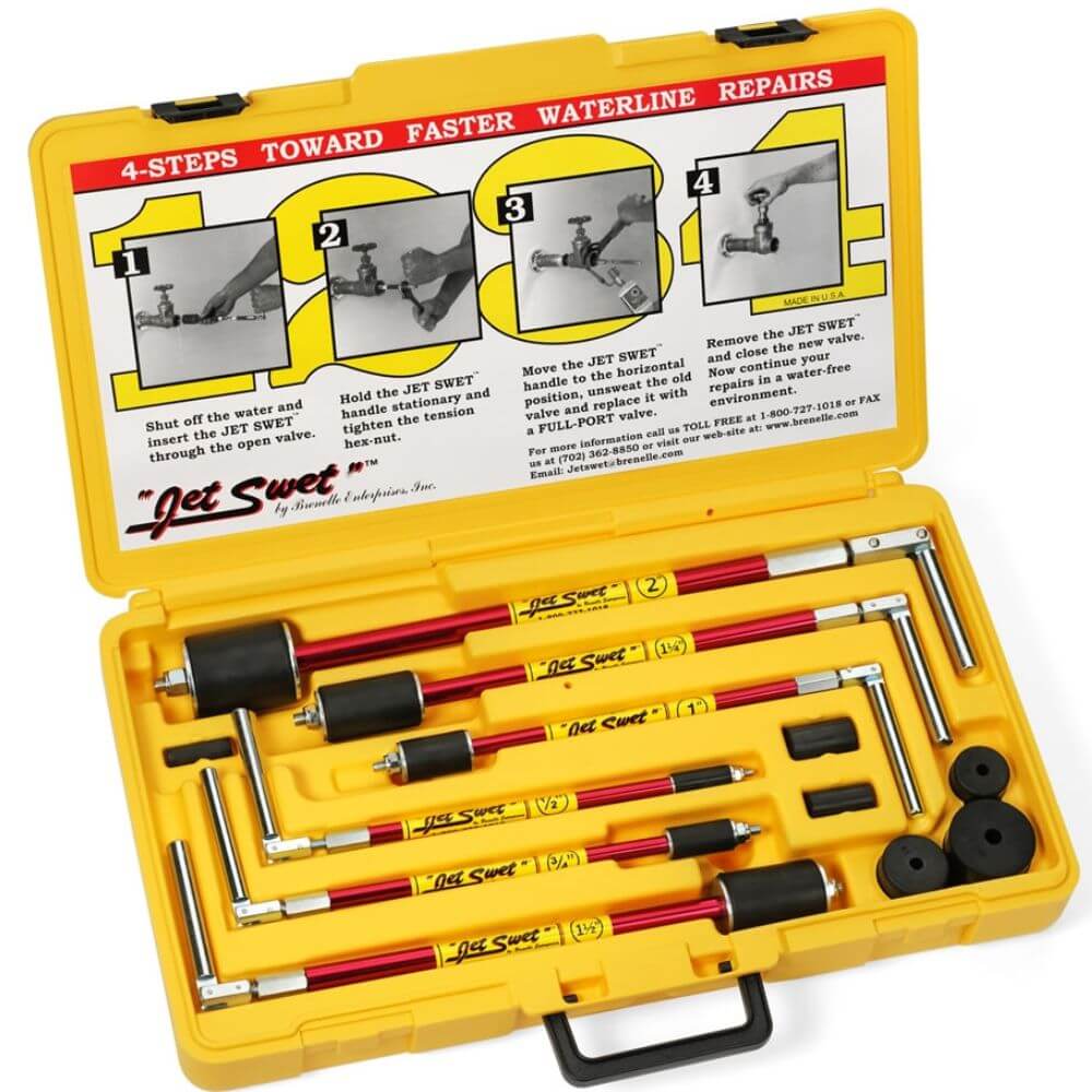 This kit contains the six standard Jet Swet™ sizes: 1/2, 3/4, 1, 1-1/4, 1-1/2 and 2 inch single Jet Swet™ tools as well as one extra replacement gasket for each tool described above.